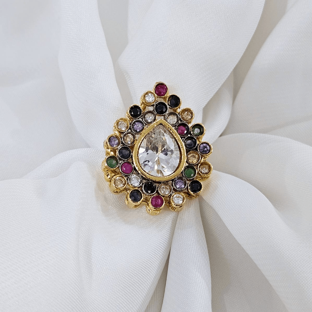 - Gold – plated jadau ring with 2 year polish guarantee.
